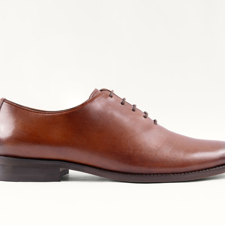 Arden, a plain fronted whole-cut oxford made from the finest tan calf leather and featuring a rubber sole.